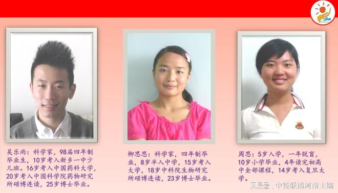柳思思、女、六岁已经学完小学四年制的三年级课程、小学只读了2年、8岁半小学毕业进入河南省实验中学学习,15岁考上大学,18岁中科院硕博连读。