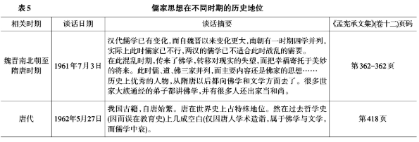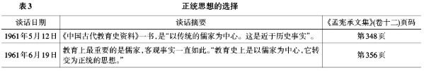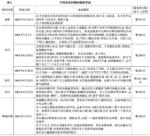 儒家思想源于孔子的学说。由于“史之阙文”,以致后人大致主要依据较为可靠或未必可靠的记载与传闻,形成有关孔子的印象。至于不同历史时期儒家学说本身的变化,对于有一定教育历史专业修养的学者来说,早已成为常识,无需赘言。姑且摘录谈话者“发前人所未发”,“略人之所详,详人之所略”的言说如下(见表4)。